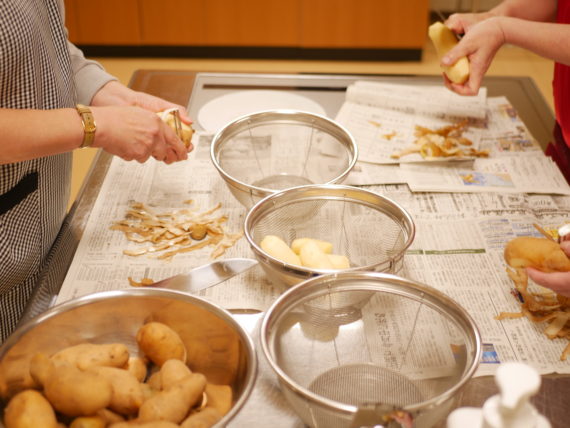 水曜日の調理室、スタッフIさんとメンバーさん数人で、畑で獲れたジャガイモの調理が