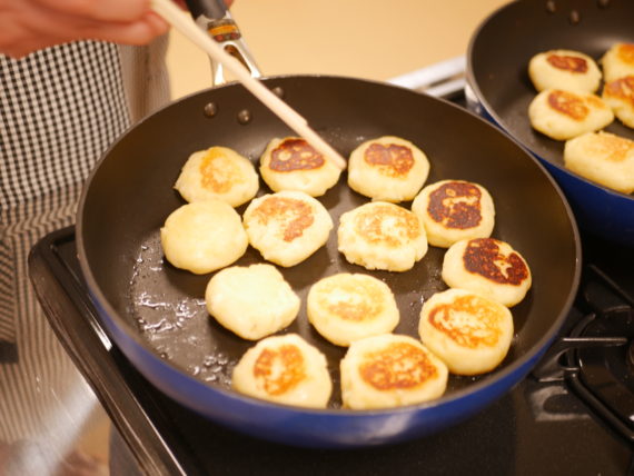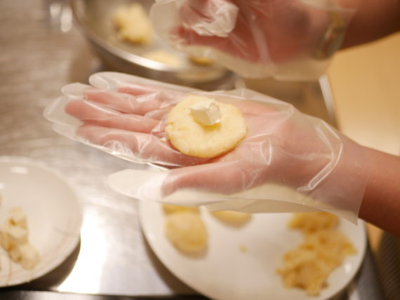 茹でてつぶしたジャガイモに片栗粉を混ぜて丸めています。