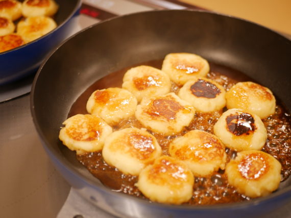 バターをひいたフライパンで焦げ色がつくまで焼いてきます。