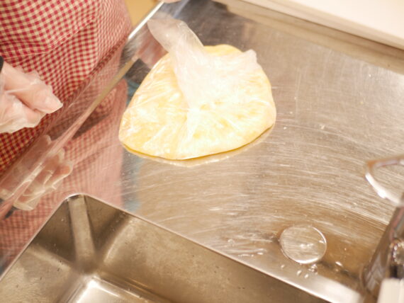 茹で上がった🥔を袋にいれてつぶします。