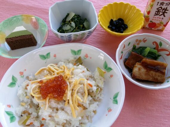 元旦は、お正月らしくおめでたい料理をお出ししました。7日の七草粥には、正月のごちそうで疲れた胃腸をいたわるという意味があります。いつもと違う食事で、大変喜んでいただけました。