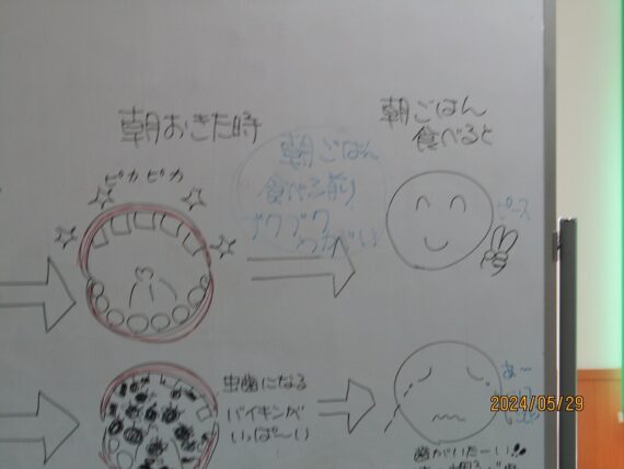 歯の模型を用いて、歯磨き方法や歯磨きしないとどうなるのかなどを患者様に指導を実施しましました!