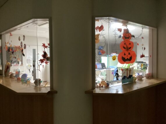 東2病棟は急性期病棟のためレクリエーションなどはないのですが、病棟でも飾り付けをして秋の気分を味わっています。