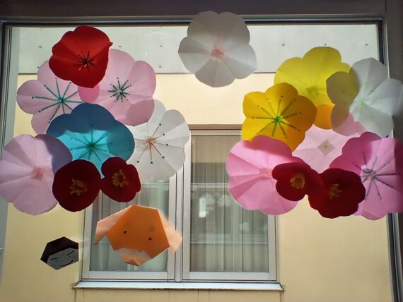 西2病棟の窓には今年度も補助者さんの手で彩とりどりで季節を感じる素敵な飾りつけがされています。