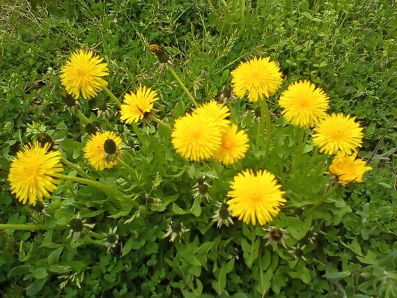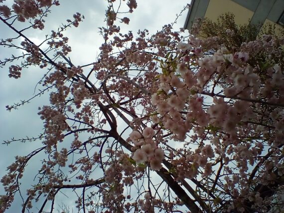 曇りで花の色があざやかではありませんが、病院敷地内のさくらとタンポポです。