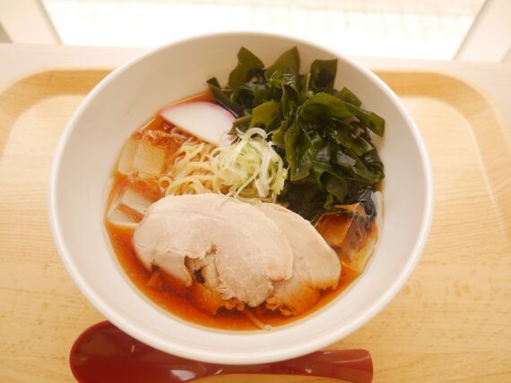冷たい氷が入ったラーメンにはたっぷりのワカメ