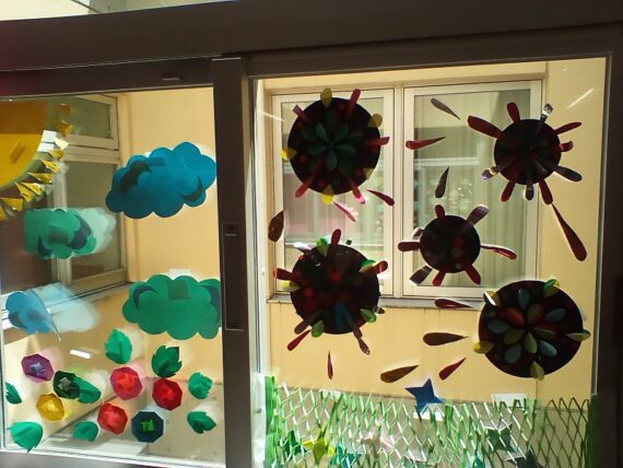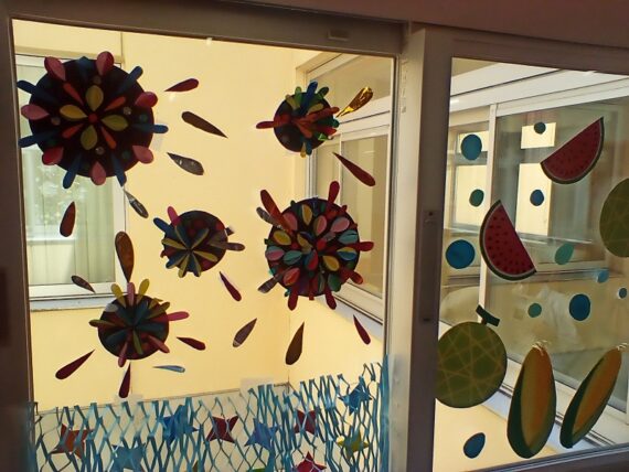 さて話が変わりまして、西2病棟では7月に入りディルームの窓に、今回も補助者さんがきれいに飾りつけをして下さいました。今月は花火を中心とした、夏らしい飾りつけとなっております。