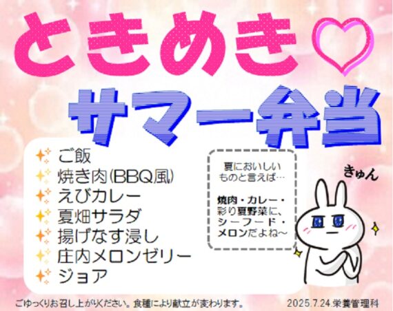 今回は、お弁当のふたを開けた患者さんに「ときめき♡」を感じてもらえたらいいな…と思い、たっぷりの夏の味覚と共に心を込めて作りました。