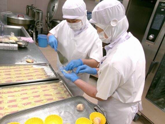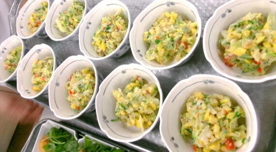 ポテトサラダ茶巾は、調理師が一つひとつ手で丸めて、丁寧に仕上げました。