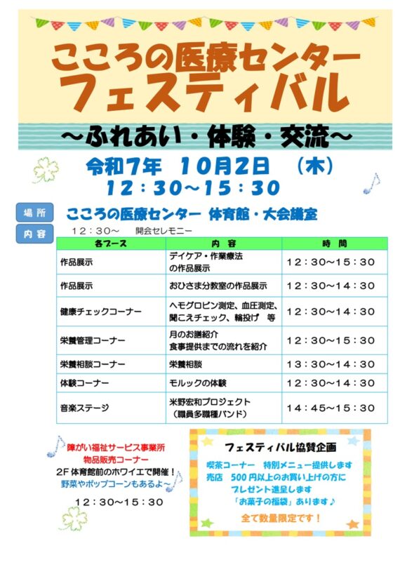 こころの医療センターでは、地域の方々との交流を深め、病院をより知っていただくことを目的に『こころの医療センターフェスティバル』を開催します。参加・体験型のブースに加え、医師、看護師、心理師など病院スタッフ有志によるロックバンドによる音楽ステージや、障がい福祉事業所の販売ブースも開設します。 皆様のご来場を心からお待ちしております。