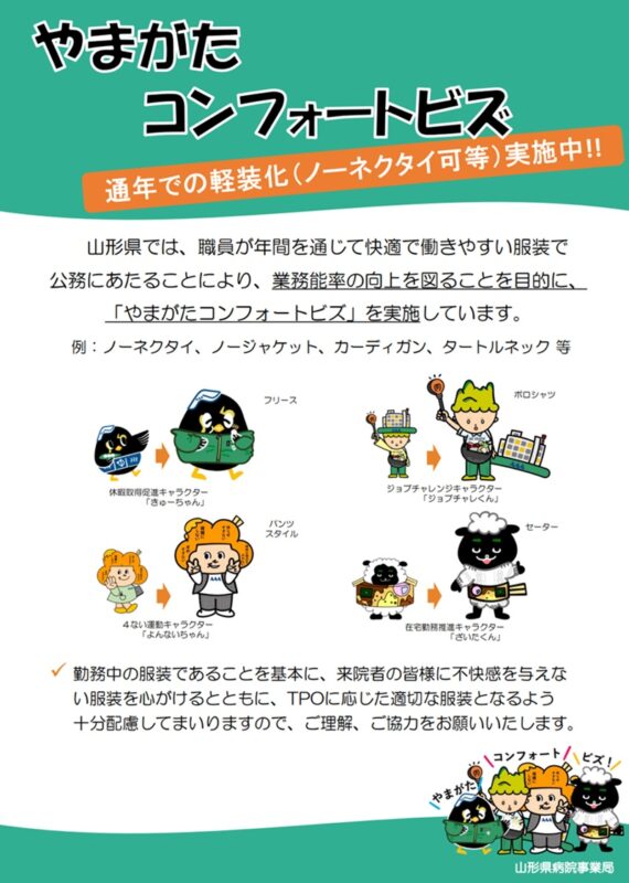 山形県では、職員が年間を通じて快適で働きやすい服装で公務にあたることにより、業務能率の向上を図ることを目的に、『やまがたコンフォートビズ』を実施しています