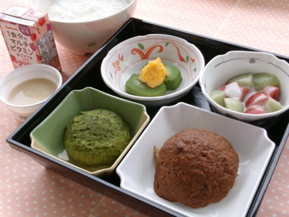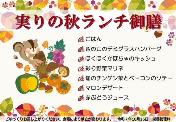 甘くて美味しい秋の実りといえば…栗やぶどう!ということで、デザートにマロンケーキ(嚥下食の方はマロンムース)と赤ぶどうジュースを提供し、患者さんにも大変喜んでいただきました。