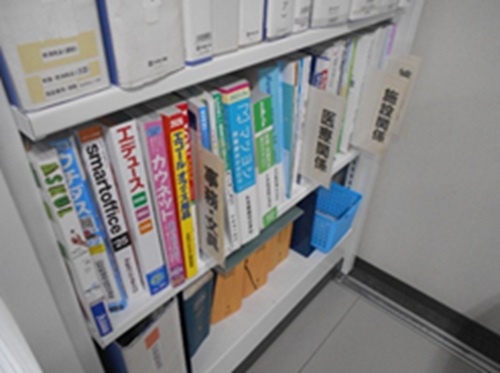 事務室の書棚には、プラスチック手袋や消毒薬などの医療用品、文房具等の事務用品、テーブルや椅子などの施設備品、職員用の被服のカタログが置いてあります。院内で使用する主な物品は施設用度係で調達していますが、「○○のようなものが欲しい」というように具体的な商品名で物品請求されないことも多いです。そのような時にカタログから該当商品を探し出して購入することがあります。そのため、施設用度係では様々な取引業者からカタログをもらって保管しています。