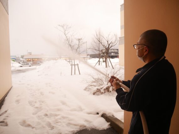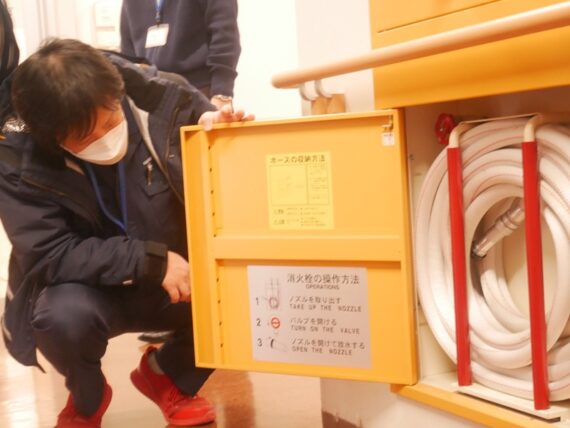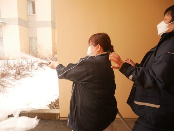 火事の知らせを受けた病棟スタッフが火元の確認と、初期消火に向かいます