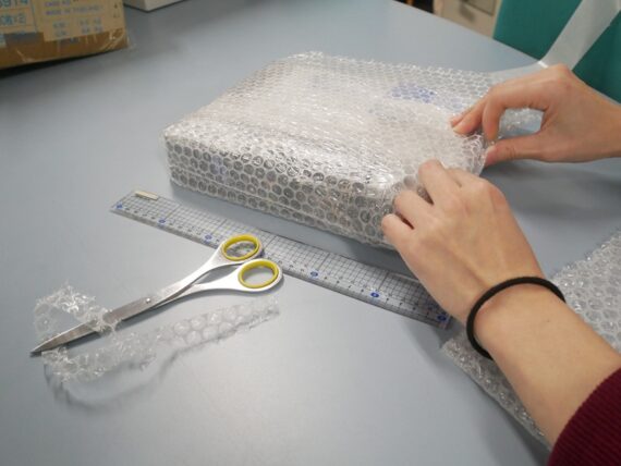 送料を少しでも抑えるため、担当の事務スタッフが「どうやって小さく梱包するか」真剣に取り組んでいます